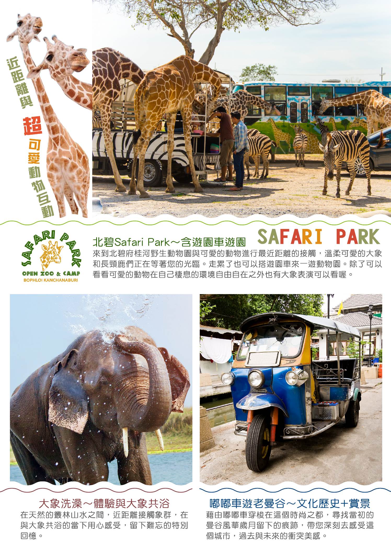 北碧Safari Park:來到北碧府桂河野生動物園與可愛的動物進行最近距離的接觸,溫柔可愛的大象和長頸鹿們正在等著您的光臨。走累了也可以搭遊園車來一遊動物園。除了可以看看可愛的動物在自己棲息的環境自由自在之外也有大象表演可以看喔。