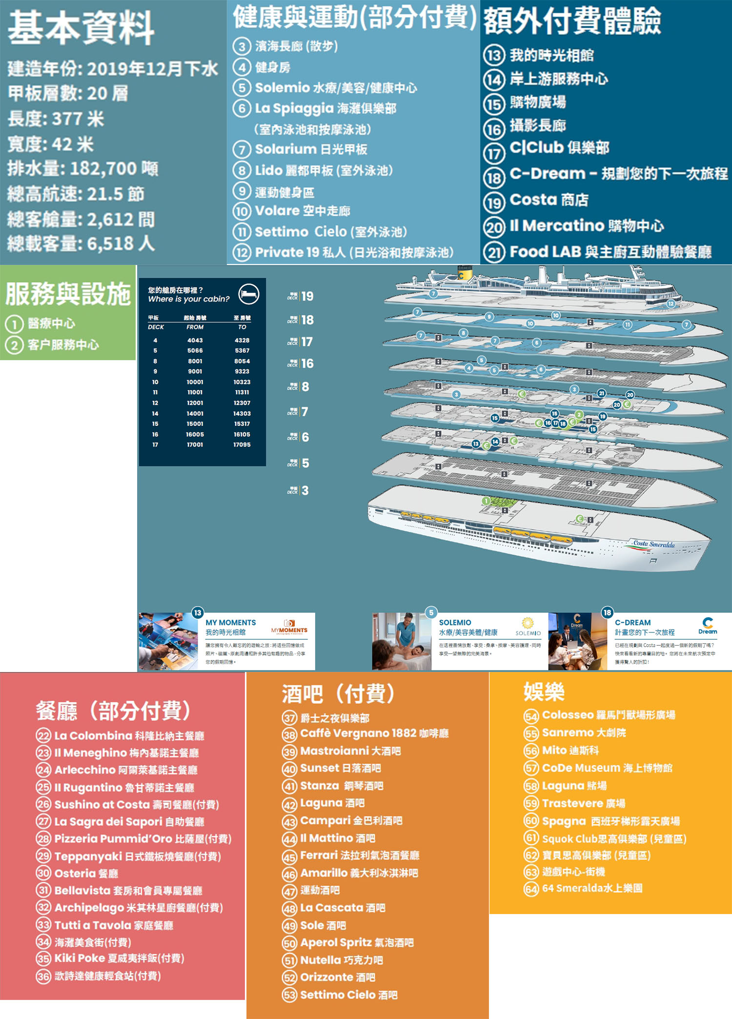 Costa Smeralda翡翠號於2019年12月21日開始航行,Costa Smeralda在義大利語是翡翠的意思,是薩丁島的一個旅遊勝地,也是世界上最美麗和最獨特的地方之一,這是對義大利最好和地中海最美麗的地方之一的一個致敬。