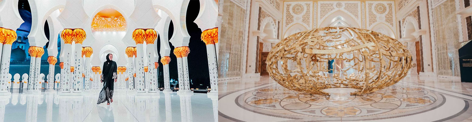 ★阿布達比大清真寺純白建築宏偉不凡,足夠容納四萬名信眾一同聚會。走進殿內,又有花紋精細的義大利雲石牆壁,由天花垂下的七盞巨型吊燈,更鑲滿施華洛世奇水晶,稱得上光芒耀目。只是最為人樂道的,還是主殿的地毯,這張全球最大的手織波斯地毯,廣達五千七百平方米,由千名伊朗婦女花費2年時間以手工編織而成,為世界最大的手工波斯地毯,無以倫比的人文與工藝造就了大清真寺的富麗堂皇!