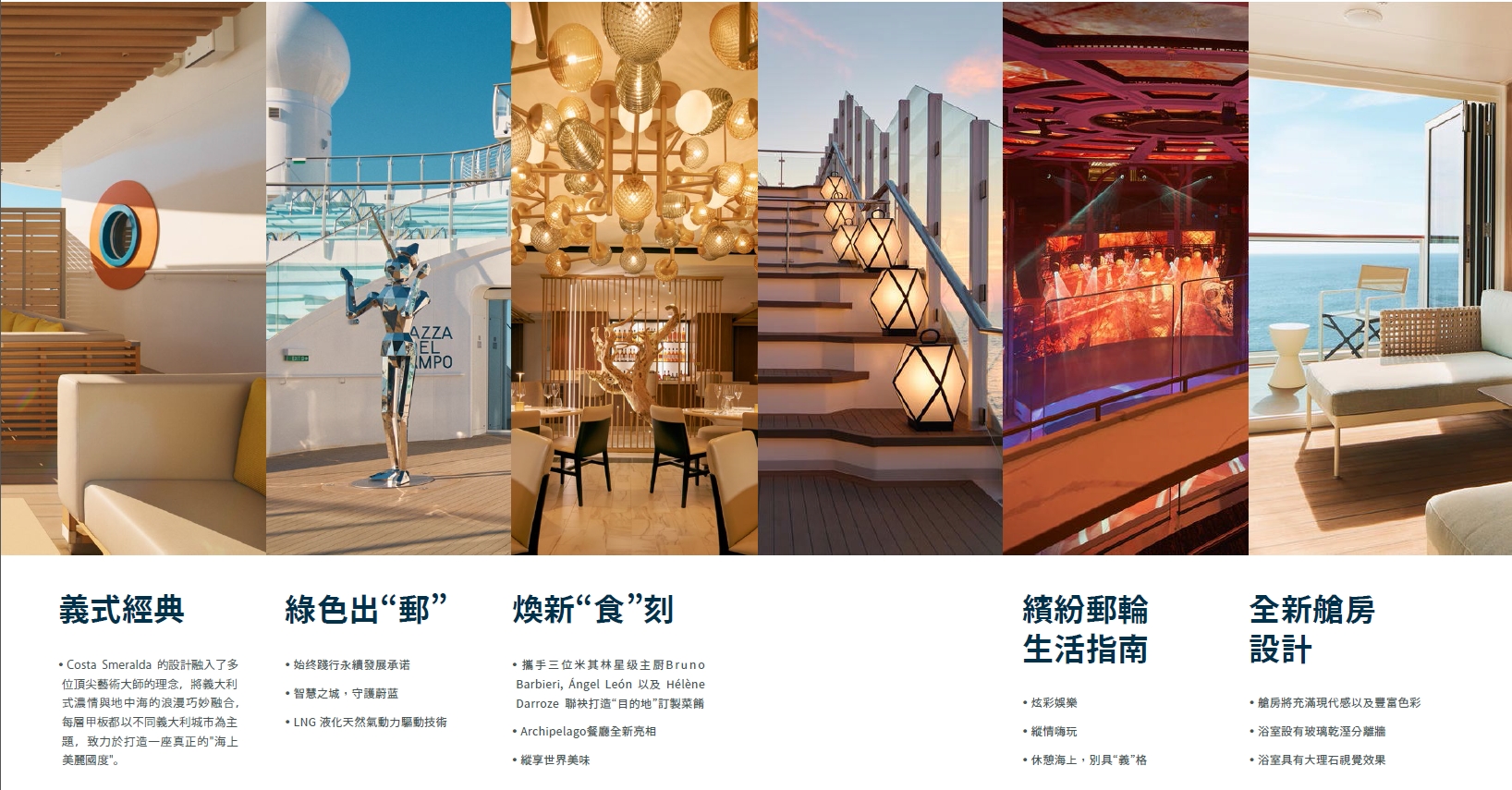 永續發展的承諾:歌詩達遊輪為全球最早採用LNG液化天然氣動力驅動技術的遊輪公司,能更有效地降低遊輪在航行和停靠過程中對環境的影響。這對海洋環境的保護具有里程碑式的意義。Costa Smeralda秉持循環經濟的概念,致力於減少顆粒物、氮氧化物和二氧化碳排放,進而實現硫氧化物零排放。遊輪還採用一系列尖端科技創新技術,例如:通過使用海水淡化器來改變海水的鹽度,滿足了日常的全部需水量。使用智慧能源效率系統,將能源消耗降至最低。此外,遊輪上的塑膠、紙張、玻璃和鋁等材料的垃圾也將進行100%分類收集和回收。值得一提的是,Costa Smeralda 上亮相的 Archipelago 餐廳設計所使用的浮木裝置材料來自「海岸護衛者」打撈行動,天然氣息滿滿。作為由歌詩達基金會(Costa Crociere Foundation)發起的海洋環境教育專案,“海岸護衛者”計劃旨在通過一系列活動和課程,讓新生代更加懂得保護海洋環境的重要性。Archipelago餐廳的部分受益將會捐贈給歌詩達基金會(Costa Crociere Foundation),用以支援環境保護和社會責任專案。