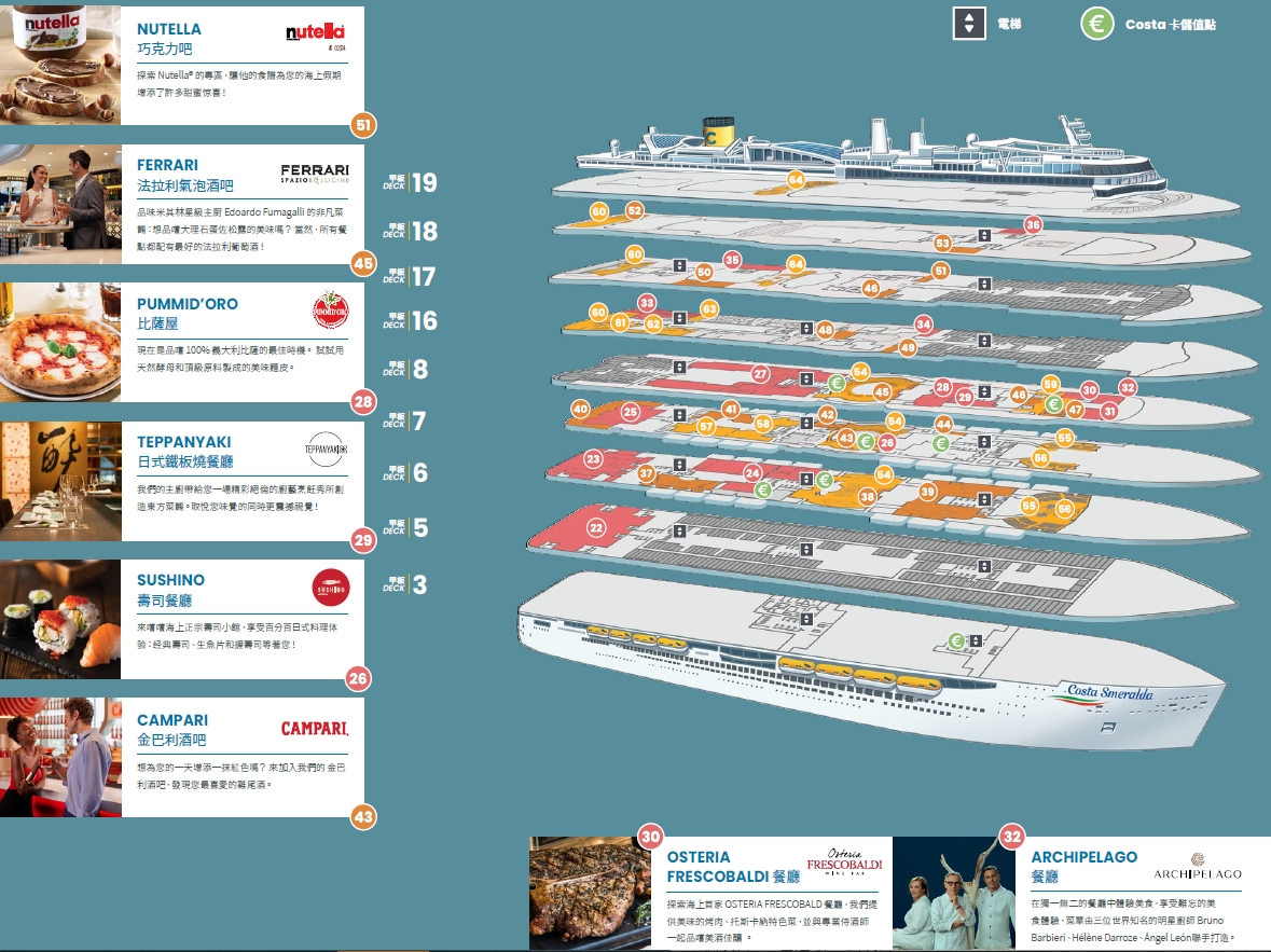美食活動:在翡翠號上可以品嘗到正宗義大利的美酒佳餚,翡翠號上特別設不同品牌的主題Bar,讓旅客細細的品味到各品牌的Signature drink,主題Bar包括ly Bar、Campari Bar、Spritz Bar、Spazio Bllicine(Cantine Ferrari)及Nutella Bar。
