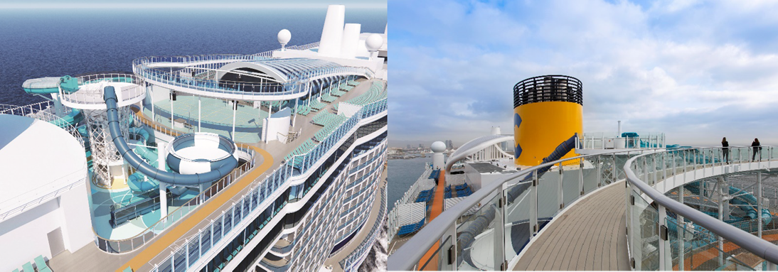 ★位於16層甲板的梯形露天西班牙廣場Piazza di Spagna橫跨三層甲板,形成巨大的梯型露天廣場,為不同的賓客提供完美的娛樂場地。廣場設有玻璃露台,行走在玻璃板上,體驗海上飛行般的感覺。 追求新奇刺激的您,一定不能錯過!